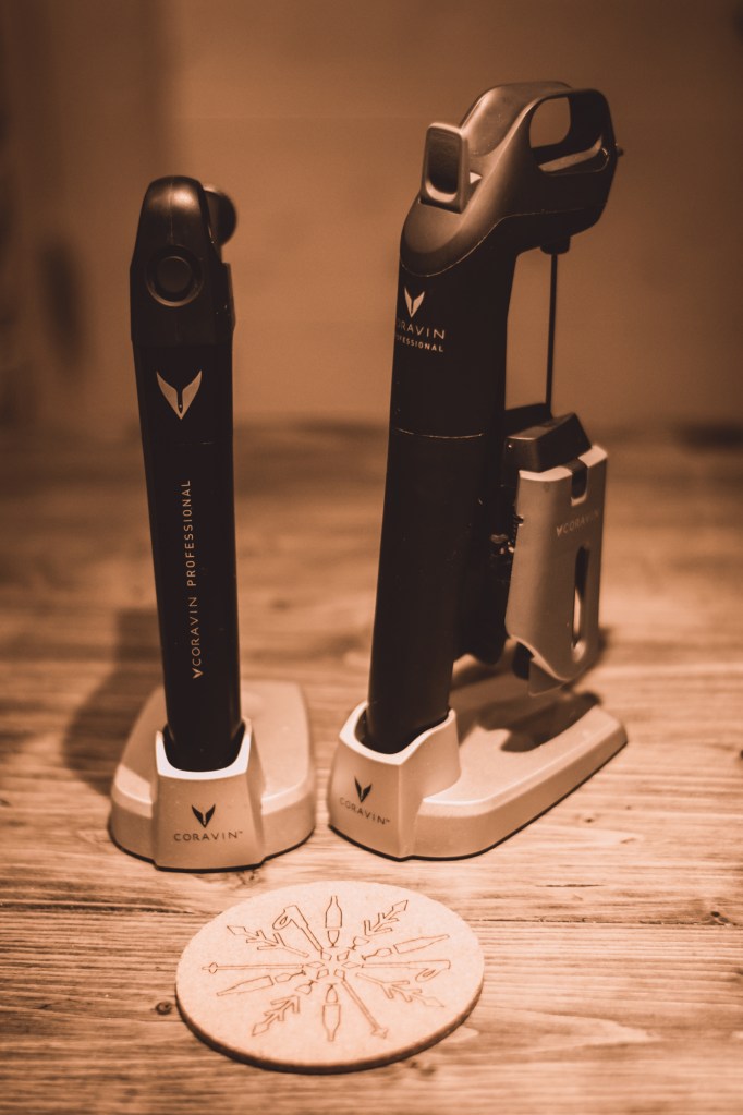 Les coravin sont des outils de conservation des vins tranquilles et des effervescents. Né de l’imagination de Greg Lambrecht, cet ustensile permet de servir le vin sans ôter le bouchon, par une aiguille qui traverse celui-ci.